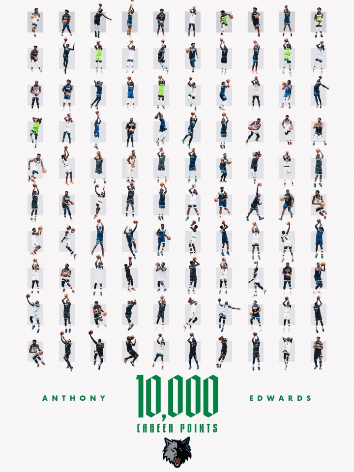 搜狐体育消息,北京时间1月9日,NBA常规赛,森林狼主场迎战骑士,爱德华兹凭借跳投得分,拿到职业生涯第10000分,成为NBA历史第3年轻万分先生。